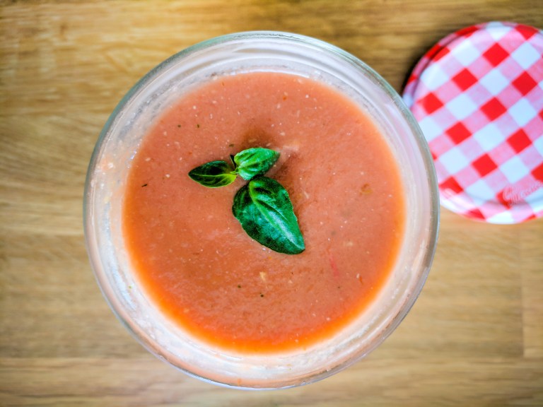 A cold tomato, cucumber, and watermelon soup with a little kick.