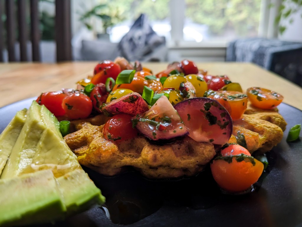 🌶🍅🥒🧇 These are unbelievably delicious and always a hit. If you serve them with maple syrup, the combination of spicy and sweet and sharp is ridiculously good.